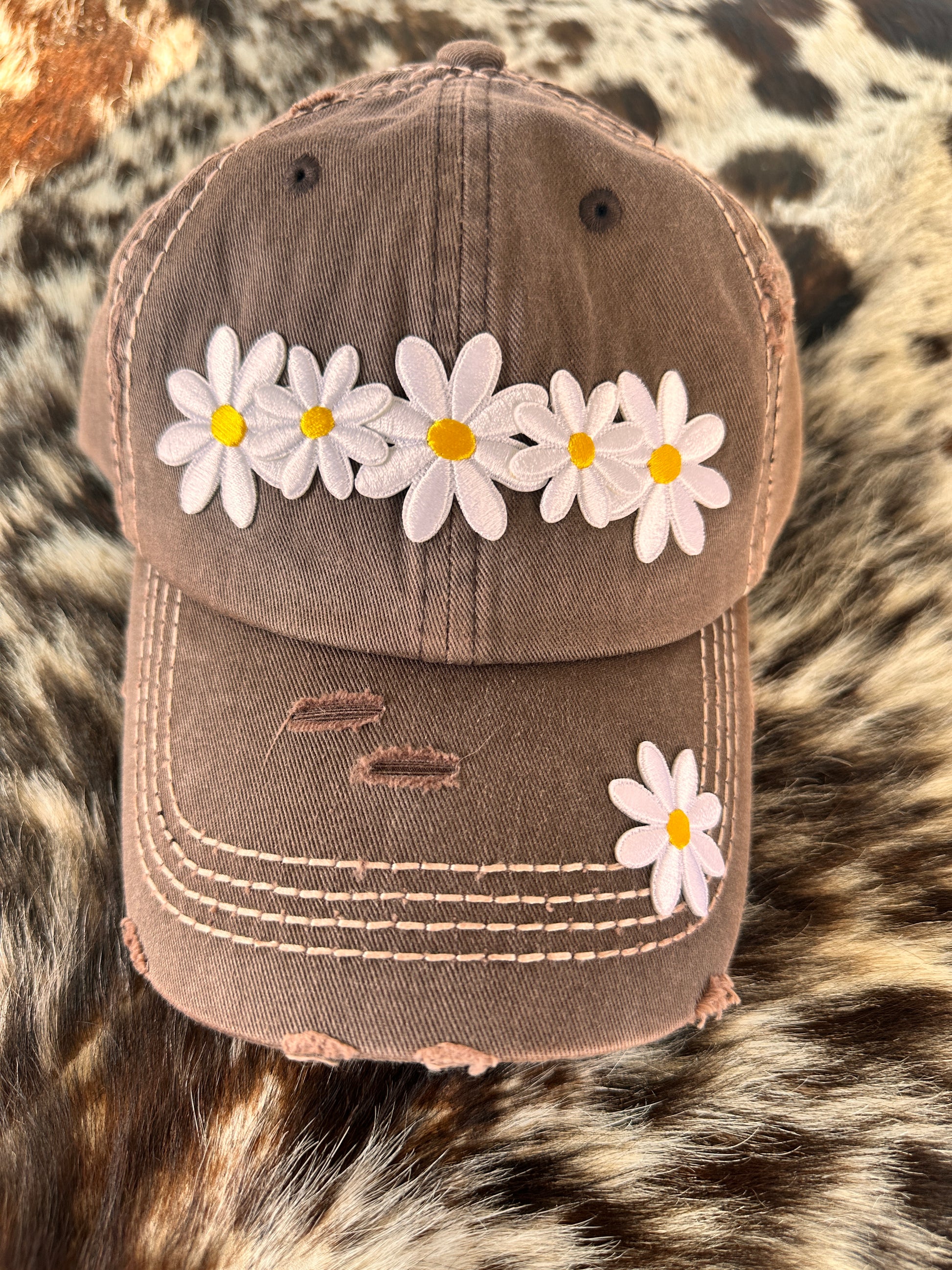 Bring a little sunshine everywhere you go with our For the Love of Daisies cap. This vintage-washed brown ball cap is adorned with a row of hand-stitched white daisies across the crown, one sweet daisy accent on the bill  & 3 tiny daisies on the back— because there’s always room for a little extra charm.